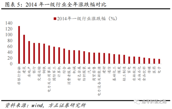 2013下半年,中国经济进入“三期叠加”阶段,即增长速度进入换挡期、结构调整面临阵痛期、前期刺激政策消化期。2014年,持续收紧的货币政策开始转向,4月首次提出了“定向降准”,部署了一系列措施来“降低社会融资成本”,开启了新一轮货币政策宽松周期。11月全面降息,这也是后续A股大牛市的重要推动力。与此同时,“一带一路”作为2014年下半年市场投资的重点,也成为蓝筹股大幅上涨的直接催化剂。随着资金的不断入场,牛市行情已经开始。2014年涨幅靠前的行业主要是金融、地产、基建等行业。