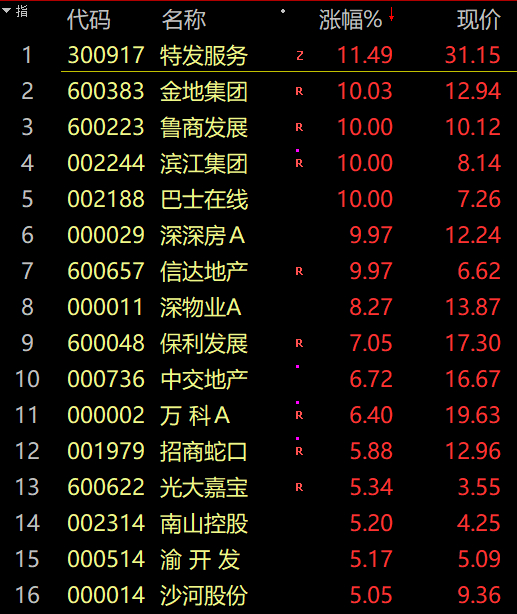 而今天资金行情大分歧,赛道股的资金纷纷跑去低迷了一段时间的地惨(产)股,房地产开发板块持续拉升,金地集团午后拉升封板,滨江集团、鲁商发展、信达地产、深深房A此前涨停,中交地产、保利发展、招商蛇口、万科A等跟涨。