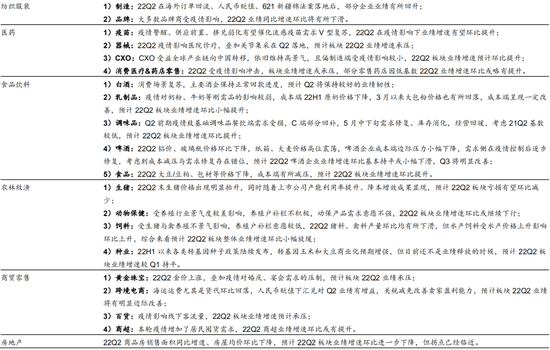 4) 下游板块受22Q2国内疫情扩散影响,中报业绩前瞻表现欠佳,仅部分子行业22Q2业绩增速可能环比上升,如商超(疫情居家隔离激发居民囤货需求)、疫苗(受益疫情扩散)、服装制造(人民币贬值+海外订单回流)、乳制品(消费偏刚需+22Q2原奶价格下降)等板块;