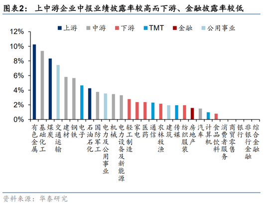 从各行业中报业绩预告披露率来看,截至2022.7.10,中上游相关板块的中报业绩预告披露率较高,有色金属、基础化工、煤炭板块的中报业绩预告披露率分别为10.3%、9.4%、8.3%;金融、下游消费板块的中报业绩预告披露率较低,银行、非银金融、商贸零售、消费者服务等板块当前暂无公司披露中报业绩预告。
