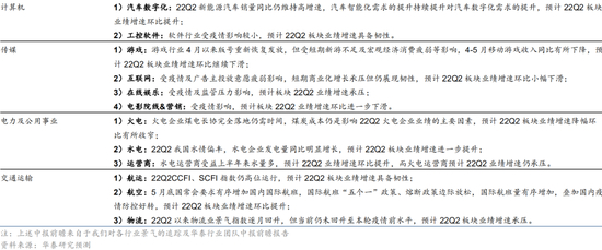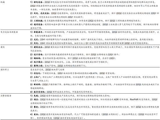 3) 中游板块中报业绩前瞻分化。材料方面,钢铁、水泥、消费建材、聚氨酯、氯碱等板块受产品价格下降、下游需求因疫情影响较弱等因素影响,22Q2业绩增速或普遍承压,光伏玻璃、化肥、纯碱等高景气板块22Q2业绩增速环比有望提升。制造业方面,需求持续向好+22Q2成本边际减压双重利好,中游制造板块22Q2业绩增速有望大多维持高位或环比上升;