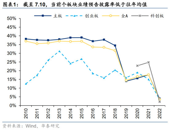 从各板块中报业绩预告披露率来看,截至2022.7.10,各板块中报披露率均低于过去10年(12年以来)的同期水平。截至2022.7.10,全A、主板、创业板、科创板的中报披露率分别为3.5%、3.9%、3.3%和2.2%,北交所暂无公司披露中报业绩预告。当前A股中报业绩预告的披露率较低,对整体的代表性有限。
