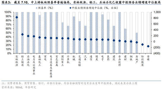 预喜率看,上游资源、中游制造板块平均预喜率相对偏高;从已披露中报业绩预告企业的业绩增速中枢来看,农林牧渔、轻工制造、石油石化、电力及公用事业等板块业绩增速较高。