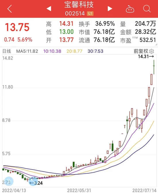 7月以来,概念股走势普遍较为平淡,仅宝馨科技逆市大涨。截至7月14日收盘,宝馨科技累计涨幅达到52.78%,该股身兼光伏、换电、储能、工业母机等多重热门题材。