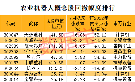 证券时报·数据宝统计,目前布局农业机器人领域的公司不足10家。按照市值规模来看,3股A股市值超百亿,分别是中联重科、航天彩虹、机器人。从估值水平来看,浙农股份、中联重科市盈率低于20倍。