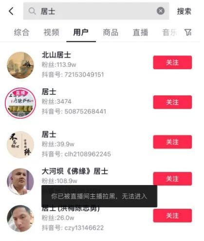 7月12日,在“居士”的抖音直播间里,市界看到大概三四分钟的时间里,“居士”先是回答粉丝自己“为什么不去快手”,后又自言自语道“怎么现在还没人点亮灯牌”。很快,没有点亮粉丝灯牌的人,便被“居士”拉黑再也无法进入直播间。“一是怕人举报,二是他们有管理,不是托的就拉黑。”于楠认为。