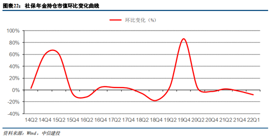 自2019年年末至2021年年末,社保基金持仓市值稳定在较高的历史区间,年均持仓市值规模为3727亿元,2022年一季度社保基金持仓市值规模为3387亿元,较前期环比下降8.1%;同时社保基金在一季度的流通市值占比为0.51%,相较于2021年年末0.49%的流通市值占比有微幅增加。