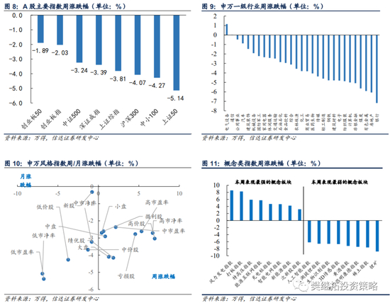本周A股主要指数全部下跌,其中创业板50(-1.89%)较为抗跌。申万一级行业本周多数下跌,其中电气设备(1.15%)、通信(0.02%)、公用事业(-0.48%)表现较好,银行(-7.17%)、房地产(-6.07%)、有色金属 (-5.91%)表现偏弱。概念股中,风力发电指数(8.55%)、打板指数(8.25%)、特高压指数(5.90%)领涨, 锂矿(-4.02%)领跌。