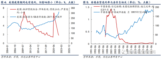 (2)房价比销售更重要。房价稳定,则即使有违约风险,也是可控的。2008年美国房地产风险扩大的最大传导链条是次贷,而导致次贷风险扩散的主要原因是房价下跌。2020年疫情后,美国也出现过房贷违约率上升,短期上升的幅度和速度不比2008年小,但随后很快下降,并没有发展成金融风险,背后很重要的原因是2020年美国房价是涨的。房价上涨期间,即使由于居民收入等问题短期还不上贷款,但由于抵押的房产在不断增值,所以违约风险很容易解决。类似地,香港住房按揭的拖欠比率也和房价负相关。
