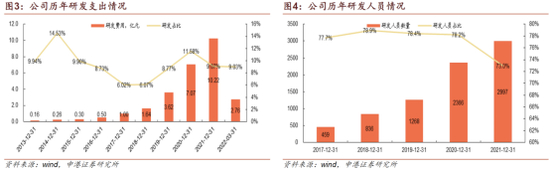 移远通信对研发是有些痴迷的。公司建成了上海、合肥、佛山、桂林、武汉、温哥华、贝尔格莱德六处研发中心,覆盖中国、欧洲、北美等地区。上市以来研发费用率总体保持在10%上下,研发费用在2021年达到10.22亿元,是2019年的近3倍,2017年的10倍。其研发人员数量也保持较高比例,最近5年均保持在70%以上,2021年略低,为73%。