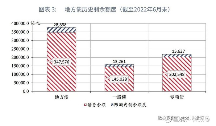 根据专项债限额管理,从限额内历史剩余额度来看,截至2022年6月末,专项债务历史剩余额度约1.56万亿元,可以动用该部分额度发行专项债券,以弥补缺口。2022年全国地方政府债务限额为37.65万亿元,其中一般债务限额15.83万亿元,专项债务限额21.82万亿元。