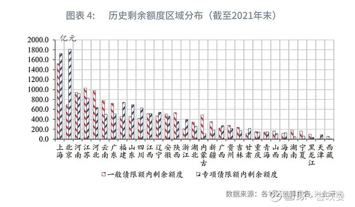 分地区来看,截至2021年,全国专项债历史剩余额度约14694亿元。基于各地已披露数据,2021年发达地区剩余额度较多,前12名省份剩余额度超1000亿元,历史剩余额度较小的省份为西藏、天津、黑龙江、宁夏、湖南等地,其历史可用额度的空间较小。
