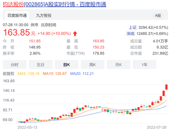 7月28日,光伏板块再度活跃,钧达股份早盘盘中加速涨停,收下3连板,最新报163.85元,总市值232亿元。钧达股份股价在2020年7月到2022年7月的104个交易日内,实现十倍涨幅,累计涨幅达1063%。
