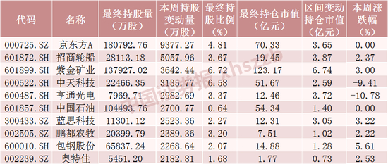 从市场表现情况来看,本周北向资金持股增加数居前十的股票中,除中天科技、亨通光电分别下跌9.41%、10.78%,京东方A、中国石油收平外,其他股票均上涨,包钢股份涨幅最大,本周上涨5.61%。