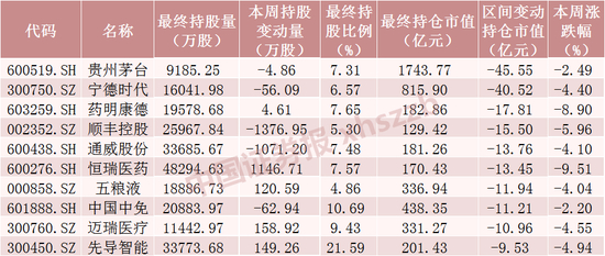 本周持仓市值减少额居前十的股票中,除药明康德、恒瑞医药、五粮液、迈瑞医疗、先导智能被北向资金分别加仓4.61万股、1146.71万股、120.59万股、158.92万股、149.26万股外,其他股票均被减仓,其中顺丰控股、通威股份被减仓超1000万股。