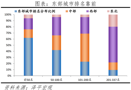 1)分地区看,发展潜力TOP50城中南方城市占据36城,力压北方;东部地区城市占据31席,领先于其他三大地区;而东北地区仅3城位于TOP50,75%城市为200名之后,经济不景气制约其房地产市场发展。分南北看,榜单前50名、51-100名中,南方上榜城市数量分别为36、30个,占比分别为72%、60%,南方城市排名靠前的占比明显大于北方。分四大区域看,榜单前50名中,东部、中部、西部、东北地区城市数量分别为31、7、9、3个,分别占区域城市数量的35%、9%、7%、8%,中西部潜力城市主要集中在成都、武汉、重庆、合肥、西安、长沙、郑州等区域中心城市,东北地区仅核心城市沈长大跻身前50名。