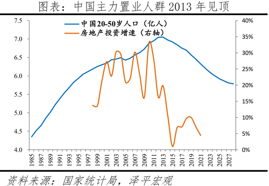 从总体看,中国20-50岁人口于2013年见顶、需求峰值已过,存量住房套户比近1.1和房地产长效机制加快构建,标志着中国房地产市场告别高增长阶段,进入高质量发展的新时代新周期。从需求看,中国20-50岁主力置业人群规模于2013年达峰值,房地产开发投资同比增速也在2013年左右开始换挡,2000-2013年房地产开发投资年均增速为24.8%,2013-2021年降至8.3%。国际经验看,主力置业人群与住宅新开工、销售相关,随着日本主力置业人群1972年逐渐接近峰值、1995年后下滑,住宅新开工套数也开始不断下滑;韩国20-50岁主力置业人群1990年代增长放缓、2005年达到峰值,住宅新开工面积在1990年达到阶段性高点、2015年开始下行。从供给看,1978-2020年中国城镇住房套数从约3100万套增至3.6亿套,套户比从0.8增至1.09,相比美国、日本的1.15、1.16,德国、英国的1.02、1.03,国内住房从供给短缺到总体平衡。从政策看,房地产调控思路以“稳”为主,“房住不炒”总基调短期不会改变,调控向长效机制过渡。