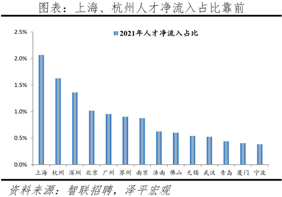 人口是一切经济社会活动的基础、人才更是第一资源。根据我们与智联招聘联合推出的《中国城市人才吸引力排名2022》,近年人才仍不断向东部城市集聚,长三角、珠三角城市群人才集聚能力逐渐增加。分区域看,2017-2021年东部地区人才净流入占比从6.2%增至12.9%,得益于雄厚的经济基础和较高的战略定位,人才持续向东部集聚;中部地区人才持续净流出,但2021年净流出占比略有下降;西部和东北地区人才持续净流出,且2021年净流出占比加大。分城市群看,超6成人才流向五大城市群,长三角、珠三角人才持续集聚,2017-2021年人才净流入占比分别从4.6%、2.0%增至7.4%、4.1%;京津冀人才净流出趋势继续放缓,成渝基本平衡,长江中游城市群人才持续净流出。随着人口红利消逝、人才价值日益凸显,如何吸引人才、留住人才并培养人才成为各城市提升综合实力的手段。2017年初以来,各地掀起“抢人大战”,城市人才竞争不断升级,2022年以来各地人才政策不断优化,包括放宽人才落户政策、提供租购房补贴、创业补贴等,逐渐从“抢人”向“抢人才”转变。