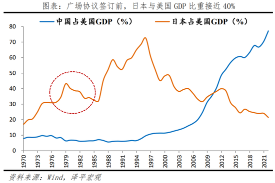 广场协议签订前,日本GDP占美比重接近40%;中国当前GDP相当于美国约77%。如果未来几年中国经济保持年均5.5%左右的增长,则将在2030年前后超越美国成为全球第一大经济体。