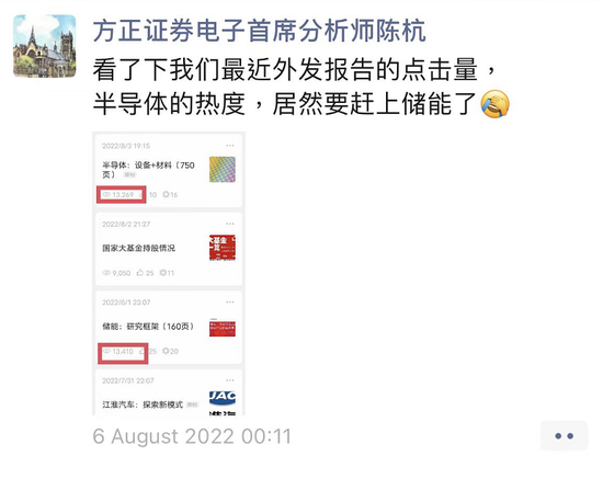 从无人问津到备受追捧,这似乎正是卖方半导体行业研究的真实现状。方正证券电子首席陈杭就在其朋友圈中表示,从近期报告的点击量来看,半导体的热度居然要赶上储能了;时隔一日,陈杭再度发声“半导体(报告)的点击量终于反超了”。