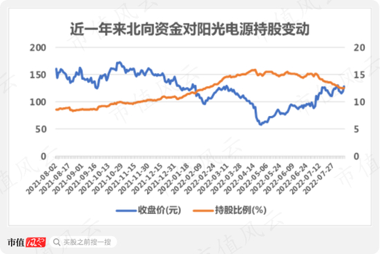 过去一年北向资金对阳光电源的持股比例一路高走,即使从2021年11月其股价不断回落,北向也是坚定持有,直到4月19日才偃旗息鼓停止加仓,随后持股比例稳中有降,截至8月9日,持仓比例下降至12.5%。