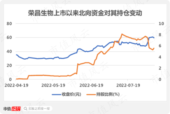 同样被加仓的荣昌生物2022年3月31日登陆A股科创板,而北向资金与它的故事是从4月19日开始的,此后连续三个月不断买入,7月14日对其持仓达到峰值,为8.1%。