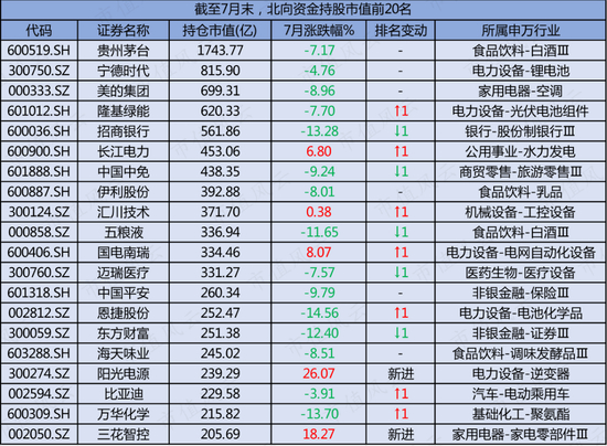 7月阳光电源和三花智控能挤入前20榜单,完全由于二者股价涨幅较大,而趁着股价上涨,北向对其均减持套现。