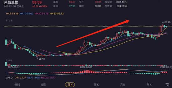 荣昌生物4月26日股价跌到谷底,为28.18元/股,随后开启反弹之路,一路冲到8月8日的最高价62.18元/股,期间涨幅高达120%,而这部分利润北向资金应该是吃到了。