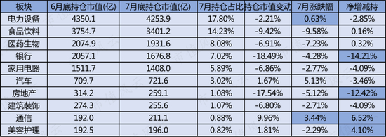 持仓变动上,7月北向资金对22个板块进行减仓,其中银行、房地产板块遭到大幅抛售,净减持超12%。取而代之的是对目前持仓占比较小的通信、美容护理板块偏爱有加。