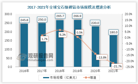 更加重要的是,由于形成难度高、储量稀缺、开采难度大,以及主要产地局势动荡等因素,2017年至2020年,天然钻石年产量一直呈下降趋势,从1.52亿克拉下降至1.11亿克拉,降幅达26.97%,2021年小幅回升至1.16亿克拉。