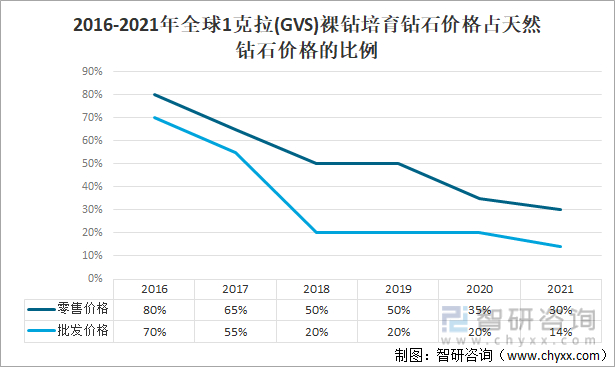 实际上,过去几年,培育钻石价格一直处于快速下降通道。智研咨询数据,1克拉裸钻零售端价格从天然钻石80%左右,降低至30%;批发端价格更是从70%降低至14%。