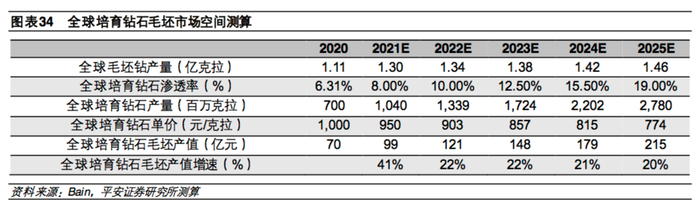 基于这一情况,培育钻石市场规模正处于快速上升通道,平安证券预计到2025年,全球培育钻石毛坯产值将达到215亿元,较2021年实现翻倍;安信证券预计全球培育钻石毛坯市场未来五年将保持33%的复合增速,五年后规模达到205亿元,培育钻石裸钻规模将达855亿元,对应复合增速为36%。