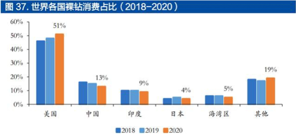 目前全球钻石消费中心是美国,占全球比重约一半,远高于第二位中国的13%,培育钻石零售市场更是有80%在美国。培育钻石中游加工中心是印度,包揽了全球近 90%的钻石加工业务。