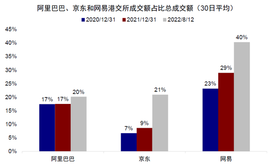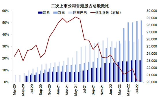 图表:目前已经回归的主要中概股公司在港交易的比例平均在20%左右,其中阿里巴巴20%、京东为21%