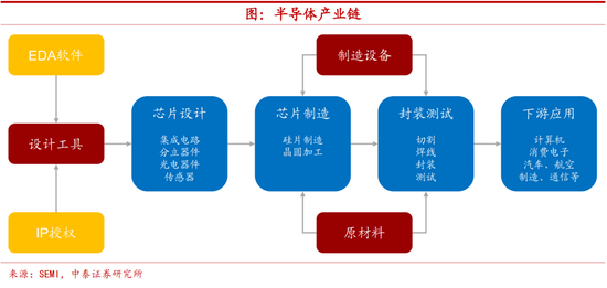 半导体产业链主要涉及设计,制造和封装测试三个主要环节。包括核心知识产权(IP),设计软件(EDA),半导体制造设备(SME)和原材料四个关键要素。首先,设计环节中,设计公司需要决定芯片在使用它的系统中应该如何运作,以此来决定芯片的规格,随后制定相应的原理模型并转化为实际板式,再进行测试检验。其次,制造环节中,原材料厂使用原材料制造出圆片状的晶圆,之后在晶圆上使用各类尖端设备构建完整的电路。最后,封装环节中,芯片厂将制造完毕的晶圆精准地切割成单个芯片,随后接受测试确保正常运作,再单独安装到电路板上。