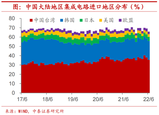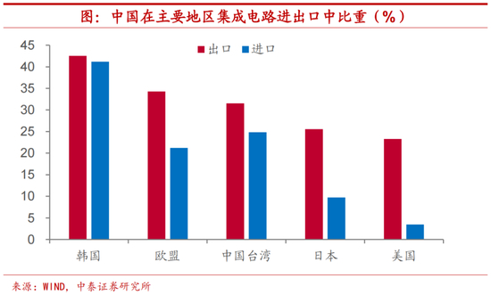 中国是多个地区芯片出口第一大市场。从芯片供应链主要国家和地区的视角来看,进口方面,韩国的集成电路对我国的进口依赖较强,约40%以上的集成电路从中国大陆地区进口,中国台湾地区的进口依赖度同样不低,约25%。出口方面,韩国集成电路对我国的出口占其集成电路出口总额的40%以上,欧盟、中国台湾地区也有30%以上的集成电路出口到中国大陆地区。