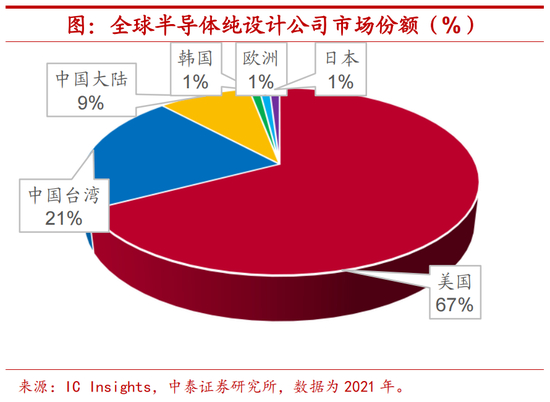 美日领先芯片设计、制造设备。在芯片设计领域中,美国和中国台湾地区占据主要地位,二者市场份额之和约9成,基本上可以说垄断设计领域,而中国大陆地区仅占9%的市场份额。在芯片制造设备中,我国仅组装封装设备份额较大,占比约为两成左右。而光刻机、晶圆生产等其他设备所占份额近乎为0,制造设备主要用于芯片制造,技术无法突破意味着中高端芯片生产面临被外国“卡脖子”。