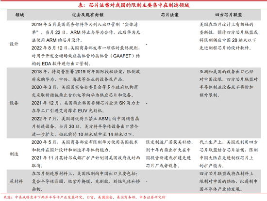 限制集中于制造领域。从法案对企业的限制来看,法案明确写道“禁止获得该法案资助的公司在10年内于中国或其他国家扩建某些关键半导体产能”。这一毒丸条款使得半导体企业陷入两难,若要接受法案的补助,则需放弃在中国市场的未来投资。此前,美国已经针对中国芯片产业链发展在设计、设备、生产和原材料四个方面实施了较为全面的限制。相比现有封锁,这次的法案针对我国的目标集中于制造业产能,主要限制我国在28纳米以下先进制程获得更大的市场份额。未来如果拜登提出的“四方芯片联盟”构想落地,不排除会在其他方面进一步加强封锁。