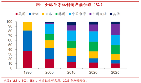中国制造产能快速增加。在芯片制造方面,2020年我国半导体制造产能约占全球产能的15%,预计到2025年产能份额将扩张至24%。而美国芯片产能份额则由1990年的37%回落至2020年的12%,或将于2025年继续回落至10%。持续的产能份额回落使得美国芯片需求无法由本土制造提供,这也是《芯片法案》推出的主要原因。