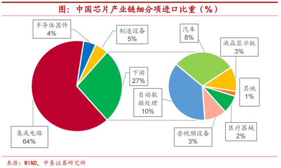 芯片制造设备进口较多。在产业链相关产品的进口中,上游产品包括光刻机、制造晶圆设备等制造设备和半导体器件,在产业链相关产品的进口额中占9%。下游产品在产业链相关产品的进口额中占27%,其中,自动数据处理设备如笔记本电脑、存储部件等进口占比最高,其次是汽车。总体而言,芯片产业链进口依赖较强。