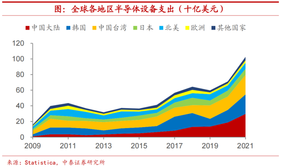 全球半导体设备支出快速上升。近年来,全球半导体市场进入“扩产潮”。一方面,由于疫情衍生出的线上教学和居家办公需求,全球经济数字化转型加速,对芯片及制造设备的需求不断增长。另一方面,随着电子设备功能升级以及各行业进入数字化转型进程,如新能源汽车和人工智能的发展,芯片的需求日益增加。为弥补芯片供需缺口,各国家和地区也在积极投资制造设备,这意味着未来芯片产能也将持续增加,而2021年中国大陆半导体设备支出占全球份额约三成。