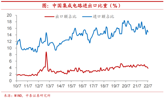 集成电路贸易逆差或将扩大。目前,我国芯片进口占总进口额的10%-15%左右,并呈现持续上升趋势,而芯片出口仅占出口总额的5%左右。这意味我国芯片产业对进口的依赖较强,而集成电路贸易持续逆差或指向出口竞争力较弱。考虑到芯片法案将禁止受补贴企业在我国建造或扩大芯片制造厂,或将蚕食我国芯片制造产能份额,芯片出口或将受到冲击。而由于国内芯片产能受到抑制,进口需求也会被进一步推升,芯片贸易逆差或将进一步扩大。