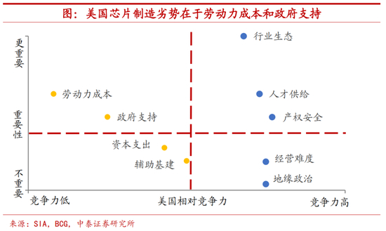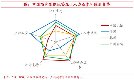 中国芯片制造优势在哪?我国芯片制造业之所以发展迅速,主要得益于我国较低的劳动力成本和全方位的政府支持。美国半导体行业协会的一项研究表明,我国在全球主要芯片制造国中提供最大的政策支持,且有着最低的劳动力成本。与此同时,我国的芯片人才供给和行业生态与主要国家差距并不算大。在中国消费市场的巨大潜力面前,在中国地区建造芯片制造厂仍是具有吸引力的选择。