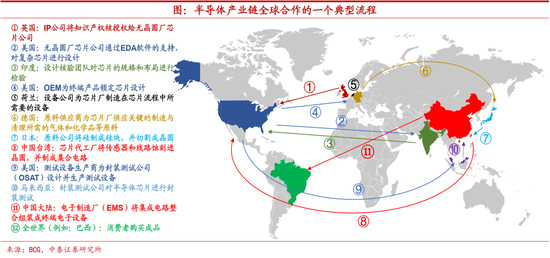 芯片产业链涉及哪些国家?目前半导体产业链分散在全球各国,我们将一个完整的芯片制造流程根据步骤和各国的优势进行拆分,梳理出一个典型的供应链:第一,英国的IP公司将知识产权授权给无晶圆厂芯片公司。第二,由美国的芯片公司借助EDA软件和授权的IP,依据客户的需求对芯片的规格进行设计。第三,芯片设计接下来则被送往印度,经过专业核验确保其符合客户需求。第四,通过核验的芯片设计再由美国的原始设备制造商(OEM)为终端产品锁定最终设计。第五,位于荷兰的半导体设备公司为芯片厂提供制造芯片的设备。第六,与此同时位于德国的原料供应商为芯片厂提供关键的化学品原料。第七,日本原料公司也将硅制作成硅块并切割成晶圆。第八,在设备与原料都准备就绪后,位于中国台湾的代工厂开始对芯片进行加工生产,制成集成电路。第九,位于美国的测试设备生产商设计并生产测试设备。第十,马来西亚的企业进行封装测试。最后,由中国电子制造厂将集成电路组装为终端电子设备,在世界各地供消费者购买。