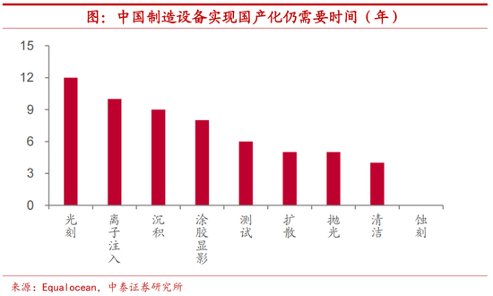 国产化道路仍然漫长。诚然,我国半导体行业在过去不断受到美国各方面的封锁,在这样的大环境下,依托国家的大力扶持,我国自主研发已经取得了一定的进展,但仍在诸多关键科技上落后于市场。根据EqualOcean的估计,我国在光刻和离子注入等领域面临着最大的科技鸿沟,仍需约10-12年才能追赶或超越前沿技术。而在其他技术如抛光和扩散上,我国的科研投入已初显成效,距离领跑行业仅剩三五年之遥。值得一提的是,我国在蚀刻技术上仍然研发出了领先世界的技术。
