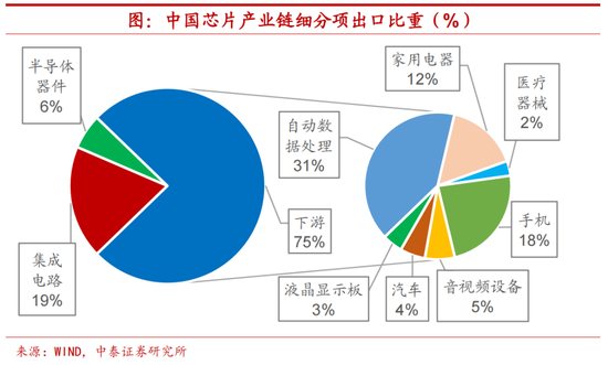 自动数据处理设备出口最大。在产业链相关产品的出口中,上游产品仅有半导体器件有出口,制造设备出口基本为零。下游产品中,自动数据处理设备、手机、家电等出口较多。若未来芯片产能受限,出口中受到影响最大的是自动处理设备和手机。一方面,二者出口在产业链相关产品中的比重较高。另一方面,二者均使用先进制程的高端芯片,而先进制程芯片的产能正是此次《芯片法案》主要限制的对象。如果高端芯片的进口受限,而我国高端芯片产能不足,那么手机和笔记本电脑等产品出口或将受到严重冲击。而对用于汽车、家电等产品的成熟制程芯片不必过度担心,我国成熟制程芯片的生产产能相对充足,因此汽车、家电等产品受影响或较小。