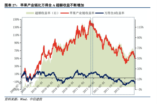苹果产业链行情进化阶段约在2009年中旬至2011年一季度,这一时期: