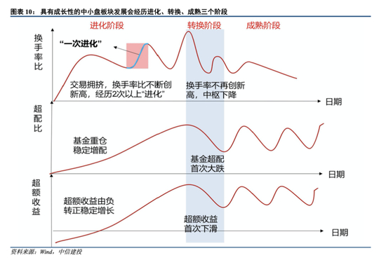 具有成长性的中小盘板块是可以通过不断进化逐渐转换到市场一致认可的主线的。因此我们将其发展阶段划分为“进化阶段”、“转换阶段”和“成熟阶段”,阶段的确定主要依赖于两个指标: