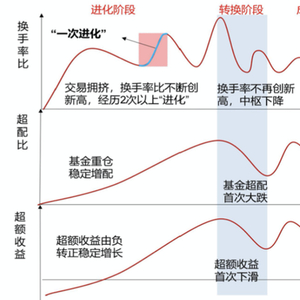 2、转换阶段:市场对资产的认知已经从发掘阶段大幅提升,配置水平到位,该阶段为交易活跃度中枢下移,换手率比不会再创前高,基金超配比例首次出现重大下滑;