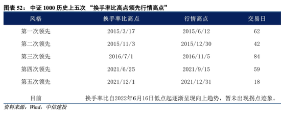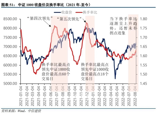当下情况:自2022年6月以来,换手率比逐渐呈现上升趋势,还暂未有拐点迹象,根据其历史经验或表明当下中小盘行情尚未结束。